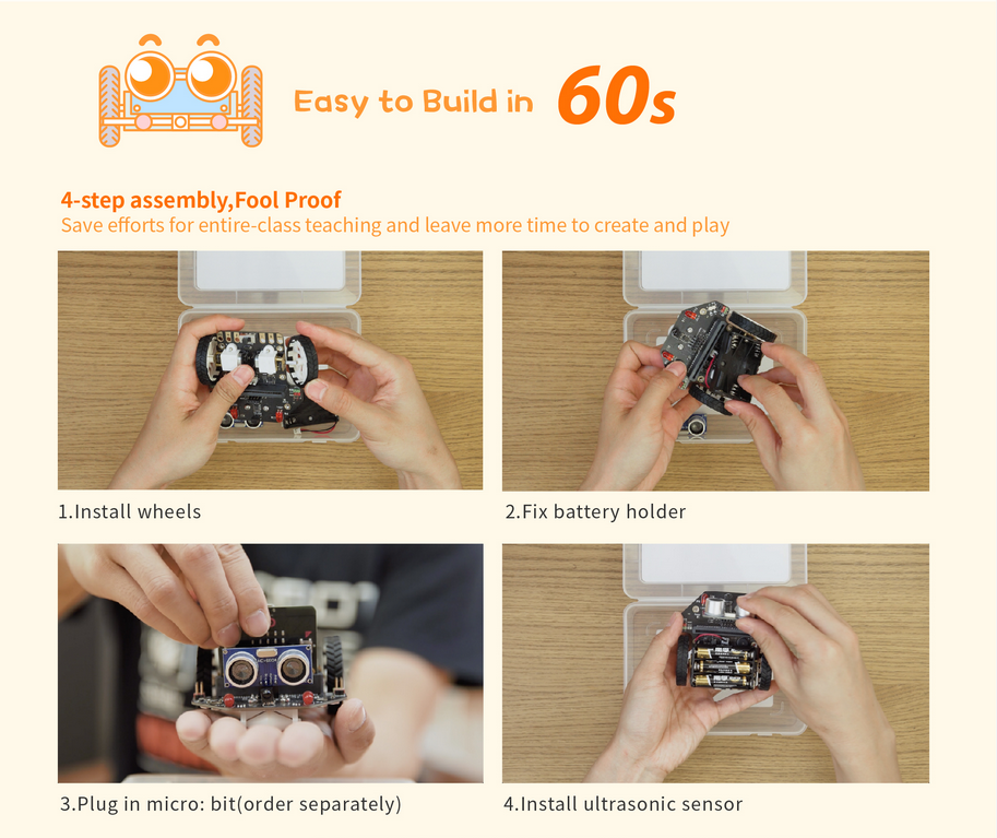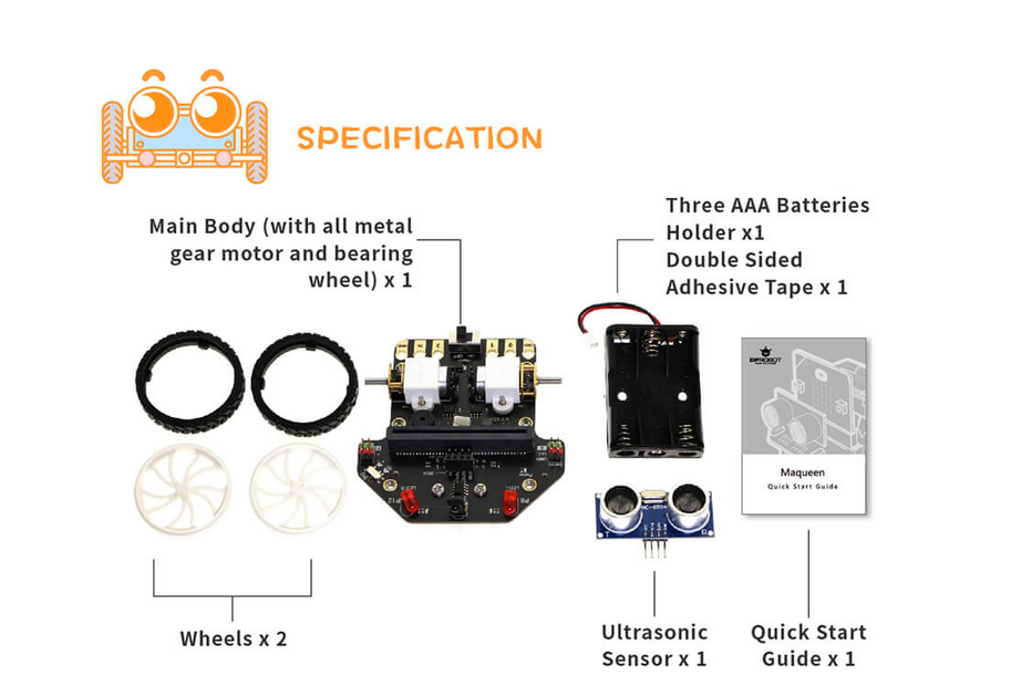Maqueen es un robot con forma de cochecito fácil de programar con micro:bit. Diseñado para educación STEAM como herramienta robótica para niños y niñas a partir de los 8 años. Los estudiantes podrán aprender rápidamente a programar de forma gráfica de una manera entretenida, al mismo tiempo que alimentan su interés en la ciencia y el pensamiento lógico.